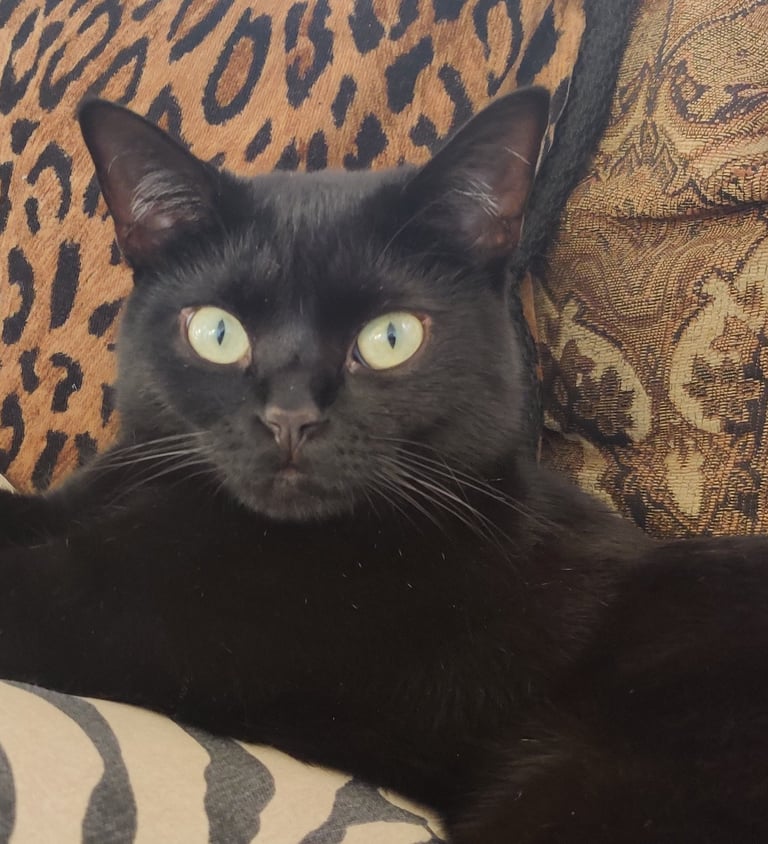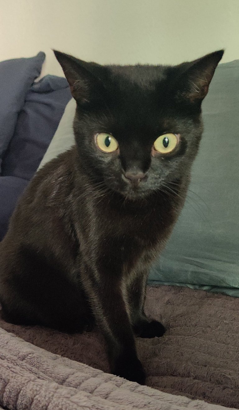 Solid black coat, short hair, small build, about 8 pounds. Large, round, greenish-yellow eyes.